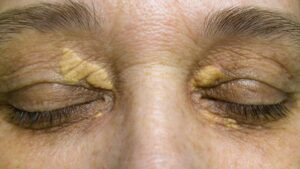 - आंखों के पास कोलेस्ट्रॉल जमा होने पर आंखों की पलकों के ऊपर कोलेस्ट्रॉल युक्त नरम, सपाट और पीले रंग की गांठें नजर आती हैं।