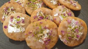 अब एक कढ़ाही में घी गर्म करके कचौड़ियों को सुनहरा होने तक पलट-पलट कर तलें। कचौड़ी का तेल निकालने के लिए उन्हें कढ़ाही से टिश्यू पेपर पर उतारती जाएं। इसके बाद सारी कचौड़ियों को चाशनी से भरे बर्तन में डालें। ठंडा होने पर बचे हुए ड्राई फ्रूट्स से गार्निश करके सर्व करें।