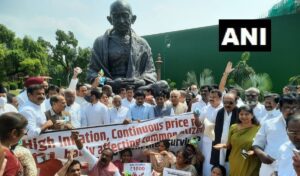 राहुल गांधी की अगुवाई में विपक्षी दलों के सांसदों ने महंगाई को लेकर संसद परिसर में धरना दिया