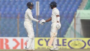 भारत और बांग्लादेश के बीच दो मैचों की टेस्ट सीरीज(test series) का पहला टेस्ट मैच चटोग्राम में खेला जा रहा है। आज इस मैच का तीसरा दिन है। दूसरे दिन के अंत तक भारतीय टीम (Indian team)ने शिकंजा कस लिया था। भारतीय टीम ने अपनी पहली पारी में 404 रन बनाए थे। बल्लेबाजी में पुजारा, अय्यर और अश्विन की अर्धशतकीय पारियों के बाद गेंदबाजी में सिराज और कुलदीप यादव का कमाल देखने को मिला है।